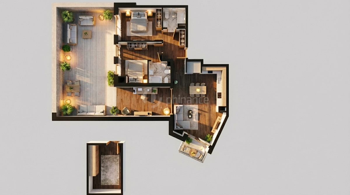 Rzut oraz wizualizacje przedstawiają przykładowy sposób aranżacji wnętrza.