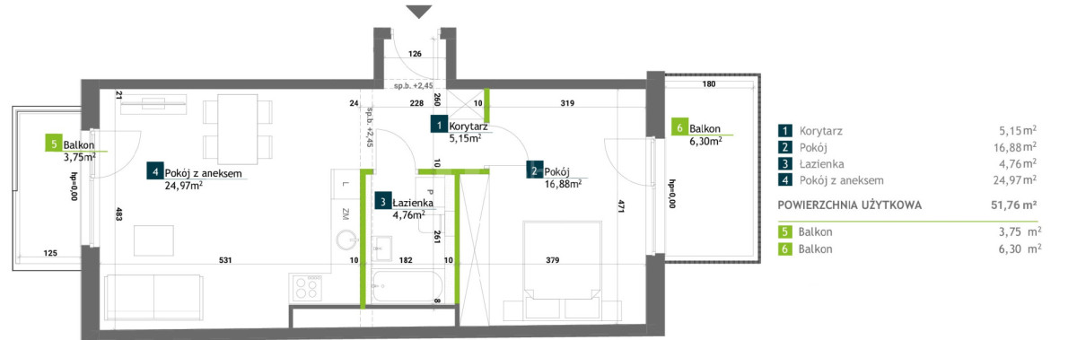 Rzut oraz wizualizacje przedstawiają przykładowy sposób aranżacji wnętrza.